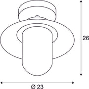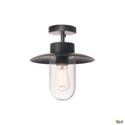 The MOLAT ceiling light equipped with an E27 socket is made of painted aluminium and a pane of glass which covers the socket. The mounted lamp head is fixed and faces downwards. It is suitable for use outdoors thanks to its IP44 protection class. The electrical connection of the luminaire, which is available in anthracite, is made to the 230V mains power supply.