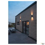 This wall light from the THEO range is made from aluminium and glass, which covers the light bulb. Thanks to the position of the two integrated fittings, the mounted light creates two identical but opposing light cones (UP/DOWN). Thanks to its IP44 rating, it is suitable for outdoor use. The light is available in a choice of three colours and can be connected to the 230 V mains power supply. The THEO range also includes ceiling lights and so can be used anywhere.