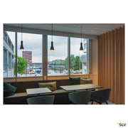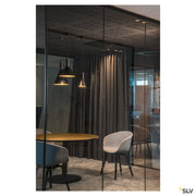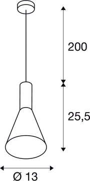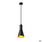 The conical shaped PHELIA high-voltage pendant offers an abundance of variations. The black and gold luminaire features a round ceiling plate. With its built-in E27 socket, the luminaire is suitable for both LED lamps and energy-saving lamps. The luminaire has a pendant length of 200 cm.