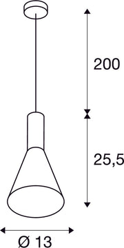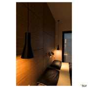 The conical shaped PHELIA high-voltage pendant offers an abundance of variations. The black luminaire features a round ceiling plate. With its in-built E27 socket, the luminaire is suitable for both LED and energy-saving lamps. The luminaire has a pendant length of 200 cm.