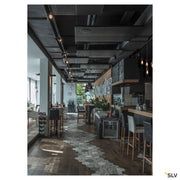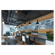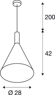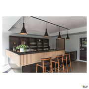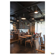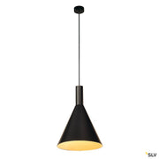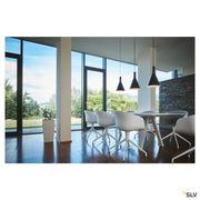 The conical shaped PHELIA high-voltage pendant offers an abundance of variations. The black luminaire features a round ceiling plate. With its in-built E27 socket, the luminaire is suitable for both LED and energy-saving lamps. The luminaire has a pendant length of 200 cm.