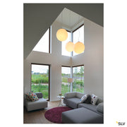 The spherical ROTOBALL 50, 240V pendant features a lamp shade made of temperature resistant plastic, optically complimented by a silver grey, steel mounting bracket. The voluminous lamp shade, coupled with a standard E27 holder for energy-saving lamps, provides even illumination characteristics. The package includes an appropriate ceiling plate. The ROTOBALL 50 pendant is thus ready for direct connection to the 230V mains supply.