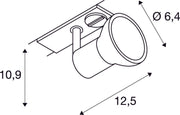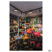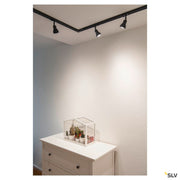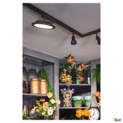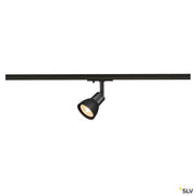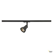 Rotatable and pivoting high-voltage PURIA spotlight with compatible adapter for the 1-phase high-voltage track system. The ready-made aluminium and satinised plastic light is suitable for use with halogen and LED bulbs thanks to the integrated GU10 base.
